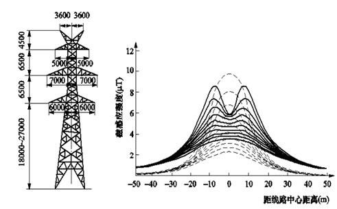 图1列举了220kV电压等级,采用猫头型铁塔,三相单回路,导线呈三角型布置的输电线路下,离地1m高度处的磁场横向分布计算曲线。曲线以铁塔中心线为坐标原点(O点),显示了磁感应强度(磁通密度)随距离的衰减关系。该图曲线对应的计算线路电流为300A(采用LGJ—300钢芯铝绞线),图中曲线自上至下对应导线对地计算高度h分别为8、9、10、11、12、13、14、15、16、17m。