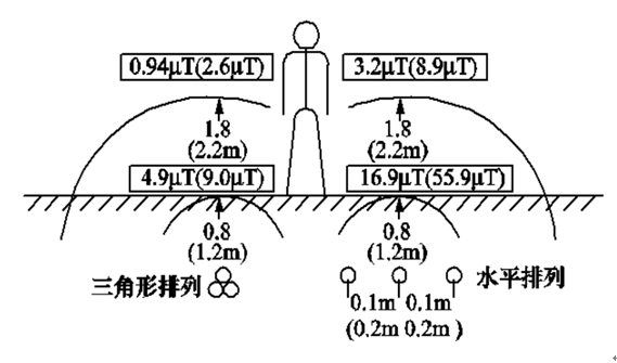 对于三相地下电缆输配电线路,在其敷设位置上方地面所产生的磁场水平,取决于电缆埋设深度、3条相线之间的距离、导线的相对排列方式以及电缆中的工作电流。将三相3根电缆的间距减小,由于不同相位的三相磁场互相抵消的作用,可明显降低地面的磁场;采用3芯电缆或将三相单芯电缆布置成三角形也可有效降低地面磁场。图3-6给出了工作电流为300A的中压(10~20kV)电缆(图中括号外数据)和工作电流为600A的高压(110kV)电缆(图中带括号数据)在常规埋设深度下产生的地面工频磁感应强度数值及分布示意图。由图3可见,在直接敷设地下电缆的地面上方路段,工频磁感应强度可达到10μT数量级,其数值比相应架空线路产生的磁场更高,但其影响范围相对较小。同样的分析结论也可见于美国南加州爱迪生电力公司的设计导则中。