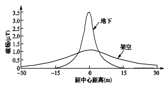 图4 66kV架空线与地下电缆产生的地面(1m高度)磁场
