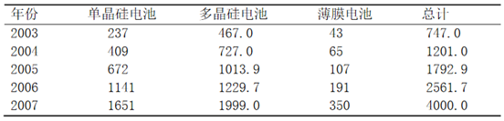 提高光电转换效率和降低生产成本。太阳能光伏电池通常用晶体硅或薄膜材料制造,前者由切割、铸锭或者锻造的方法获得,后者是一层薄膜附着在低价的衬背上。晶体硅仍是当前太阳能光伏电池的主流。晶体硅电池包括单晶硅太阳电池和多晶硅太阳电池。单晶硅电池的实验室*高转换效率可达24.7%,商业化电池效率为16%~20%。多晶硅太阳能电池的实验室*高效率也超过了20%,商业化电池效率为15%~18%。除效率外,电池的厚度也很重要。降低硅片厚度是减少硅材料消耗、降低晶硅太阳电池成本的有效技术措施。硅片的平均厚度已从2003年的0.23mm减小到2007年的0.18mm。下表为2003—2007年各类太阳能产量MW
