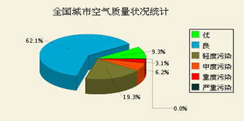7月7日全国城市空气质量日报对全国城市空气质量状况的检测结果做了详细的介绍,其中监测指标为空气质量指数,即air quality index(AQI)。其中,3.1%的城市为重度污染,6.2%的城市为中度污染,19.3%的城市为轻度污染,62.1%的城市空气质量为良,仅有9.3%的城市空气质量为优。