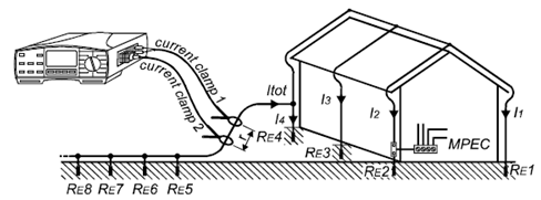 测量结果=(RE1-RE4接地系统总的接地电阻)+(RE5-REn辅助接地系统接地电阻)