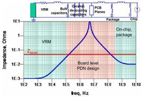 在调试该故障前先回顾下电源噪声抑制的原理。如下图所示,电源分配网络中不同的频段由不同的元件来抑制噪声,去耦元件包含电源调整模块(VRM)、去耦电容、PCB电源地平面对、器件封装和芯片。VRM包含电源芯片及外围的输出电容,大约作用于DC到低频段(100K左右),其等效模型是一个电阻和一个电感组成的二元件模型。去耦电容*好使用多个数量级容值的电容配合使用,充分覆盖中频段(数10K到100M左右)。由于布线电感和封装电感的存在,即时大量堆砌去耦电容也难以在更高频起到作用。PCB电源地平面对形成了一个平板电容,也具有去耦作用,大约作用在数十兆。芯片封装和芯片负责高频段(100M以上),目前的高端器件一般会在封装上增加去耦电容,此时PCB上的去耦范围可以降低到数十兆甚至几兆。因此,在电流负载不变的情况下,我们只要判断出电压噪声出现在哪个频段,那么针对这个频段所对应的去耦元件进行优化即可。在两个去耦元件的相邻频段时两个去耦元件会配合作用,所以在分析去耦元件临界点时相邻频段的去耦元件也要同时纳入考虑。