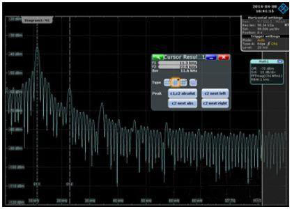 电源噪声测量时不要求较高的采样率,所以可以设置很长的时基,这也意味着采集的信号时间可以足够长,可以认为覆盖到了整个有效信号的时间跨度,此时不需要添加窗函数。调整以上设置可以得到比较准确的FFT变换曲线了,再通过zoom功能查看感兴趣的频点。如下图中电源噪声的主要能量集中在11.3KHz左右,并以该频率为基波频率谐振。据此可以推断本PDN网络在11.3KHz处的阻抗不能满足要求,电容在该频点的阻抗也比较高,起不到降低阻抗的作用,所以前面增加电容并不能减小电源噪声。