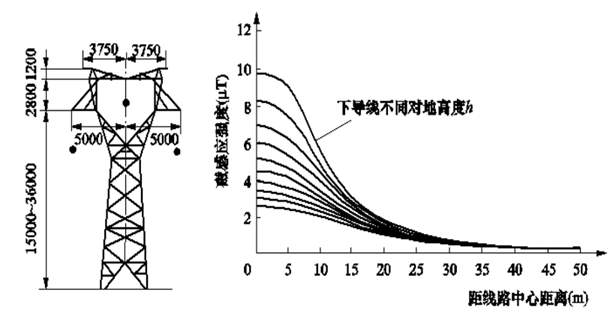 图1列举了220kV电压等级,采用猫头型铁塔,三相单回路,导线呈三角型布置的输电线路下,离地1m高度处的磁场横向分布计算曲线。曲线以铁塔中心线为坐标原点(O点),显示了磁感应强度(磁通密度)随距离的衰减关系。该图曲线对应的计算线路电流为300A(采用LGJ—300钢芯铝绞线),图中曲线自上至下对应导线对地计算高度h分别为8、9、10、11、12、13、14、15、16、17m。