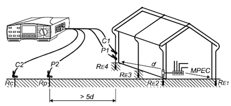 电压及电流测试杆的安装位距离接地系统比较远,因此接地点可看做为一点。其中d为接地系统中,相距*远的两个接地电极的距离。电流探头的距离至少为5d。