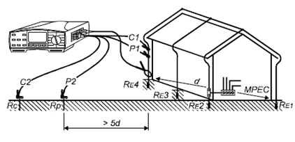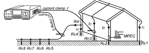 测量结果=(RE1-RE4接地系统总的接地电阻)+(RE5-REn辅助接地系统接地电阻)