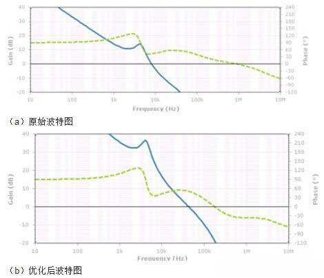 一般来说,11.3KHz应该是VRM的管辖范围,此处出现较大噪声说明VRM电路设计不能满足要求。这里对VRM的性能进行分析,VRM分析的方法众多,此处主要采用仿真其反馈环路波特图的手段。波特图主要观察几个关键信息:1、穿越频率,增益曲线穿越0dB线的频率点;2、相位裕度,相位曲线在穿越频率处所对应的相位值;3、增益裕度,相位在-360°时所对应的增益值。这里我们主要关注穿越频率和相位裕度这两个指标。从VRM的环路波特图(如下图a)可以看到,VRM的穿越频率在8KHz左右,相位裕度37度。这里存在两个问题:首先VRM的相位裕度一般需要大于45度才能保证环路的稳定工作,这里相位裕度稍小一些,需要增加相位裕度;其次穿越频率太低,穿越频率附近VRM的调整作用逐渐降低,而此频点bulk电容还起不到作用,所以在8KHz附近会存在较高的阻抗,这个频点的噪声抑制作用较差。下图(b)是优化VRM环路之后的波特图,调整相位裕度到50度,穿越频率推到46KHz左右。