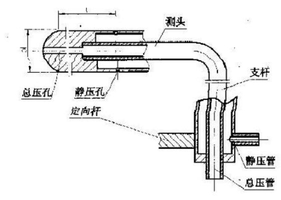 L型皮托管用两根不同直经不锈钢管子同心套接而成,内管通直端尾接头是全压管,外管通侧接头是静压管。指向杆与测杆头部方向一致,使用时可确定方向,使测头对准来流方向。