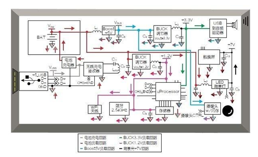 图3中的每个电源都被颜色编码以便区分,图中*重要的部分是彩色标识的GND返回电流。因为多个电源是串联的,导致每个*终负载和GND电流被迫以它们被加电时相同的顺序去完成返回路径。例如,电池为BUCK1.2V调节器加电,该调节器为微处理器供电。因此,流经微处理器的电流在返回到电池之前,将直接返回到BUCK1.2V调节器器GND端。如果未能预见到全部的电流回路和电流路径完成的次序,*可能导致电路运行不稳定,或者没有足够的 GND电流返回,原因是这些问题没有在电路布局中适当地考虑到并加以控制。